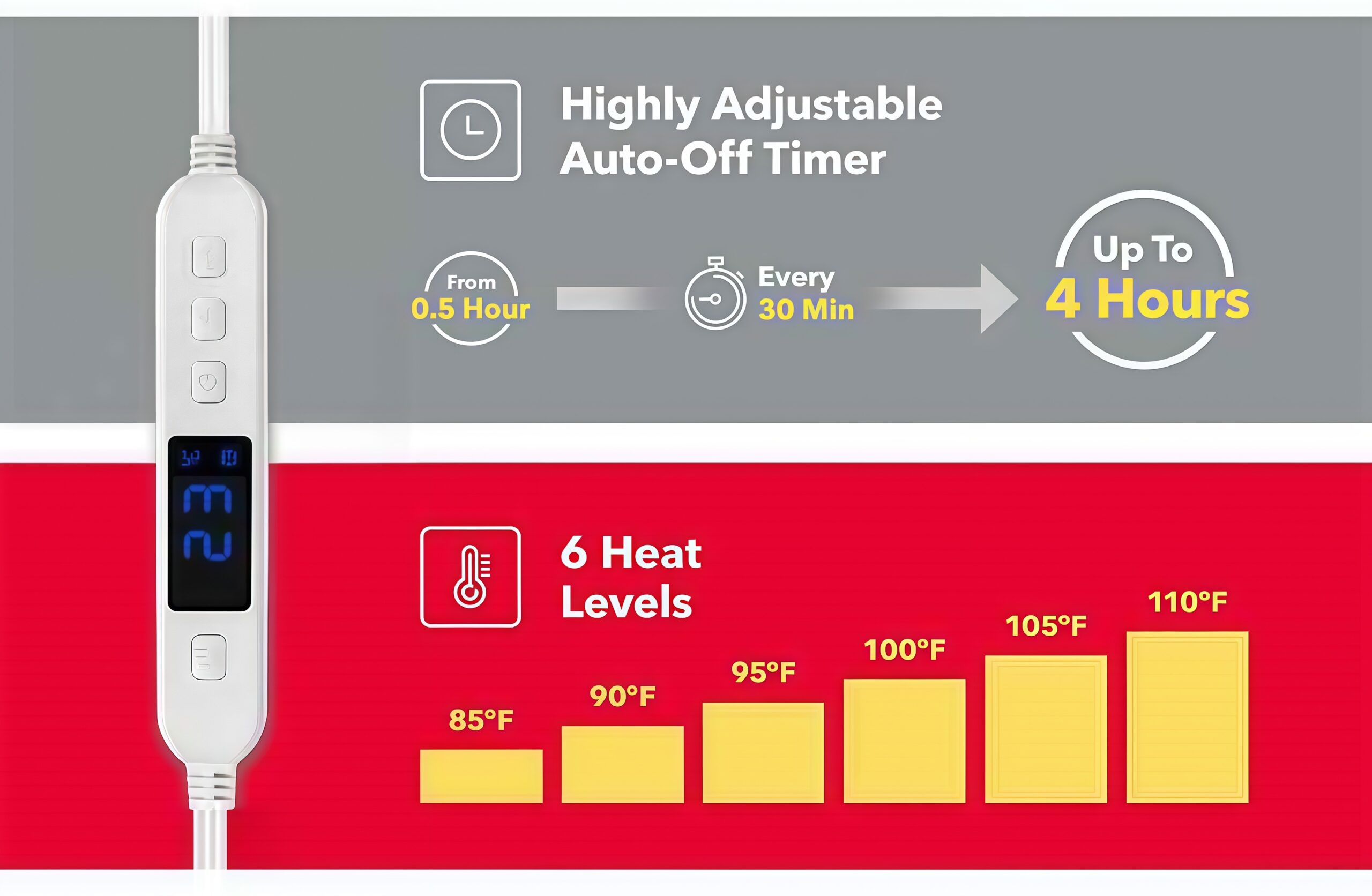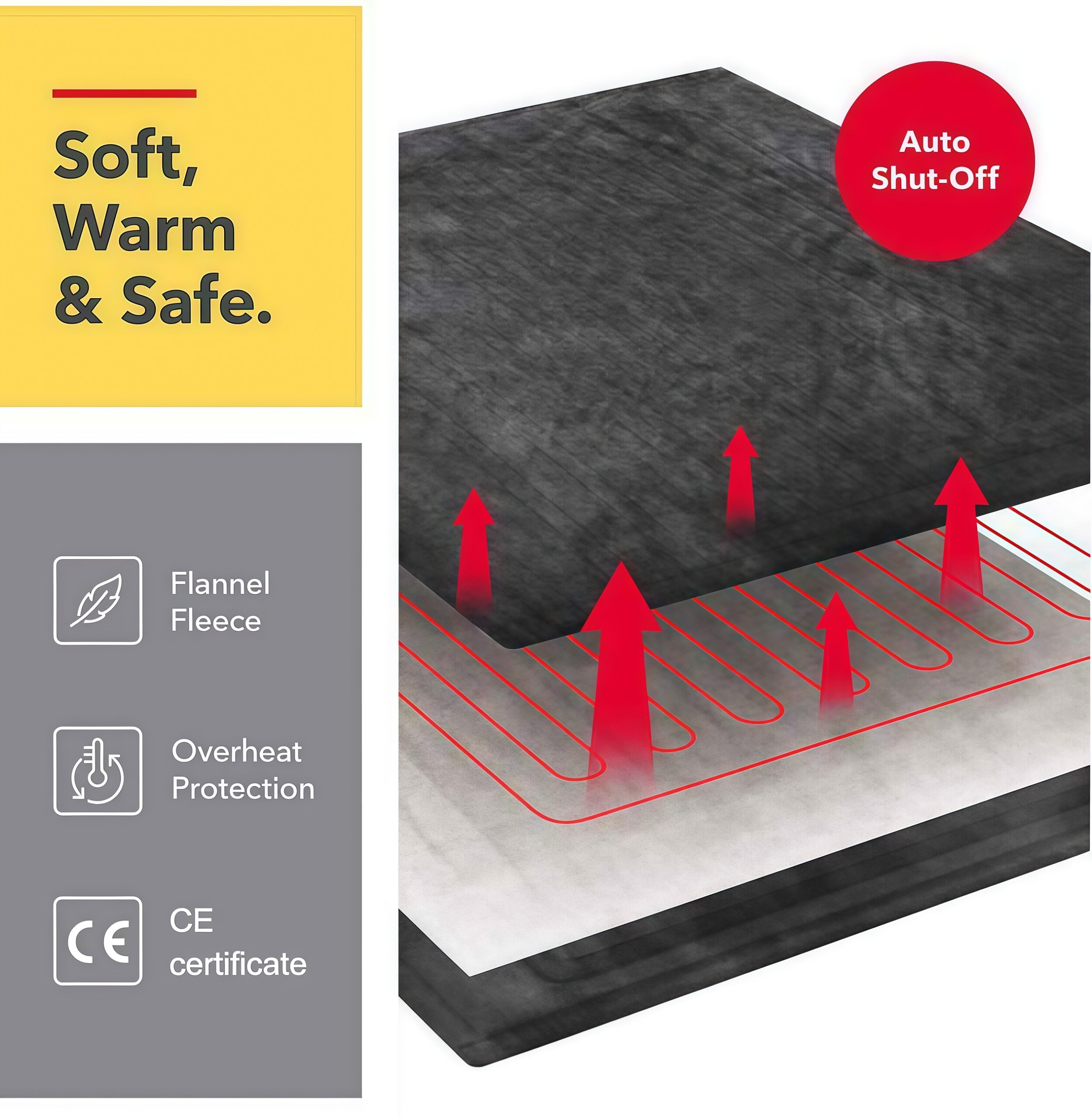 柔らかさと安心:フランネル生地と自動オフ機能 肌触りの良いフランネル生地と、内蔵された均一発熱回路が心地よい温もりを届けます。過熱保護機能と自動オフ(Auto Shut-Off) を搭載し、CE認証も取得しているので、安心して就寝時にもお使いいただけます