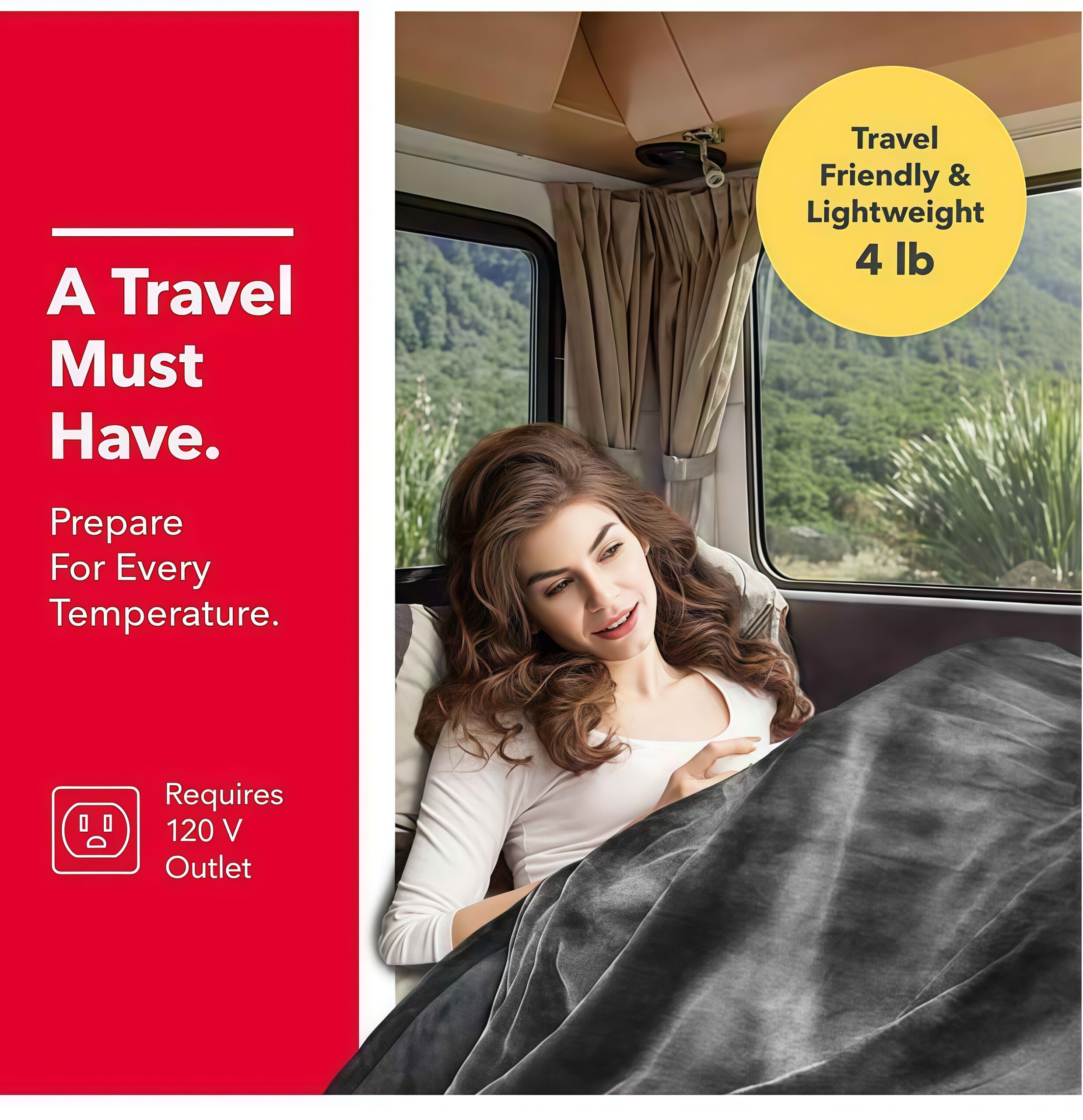 旅先にも携帯できる、軽さと温かさ 本体重量はわずか約1.8kg。キャンピングカーやホテル、オフィスでさっと広げるだけで温もりが広がります。120Vのコンセントに接続するだけですぐにお使いいただけ、旅先での急な気温変化にも快適に対応します。