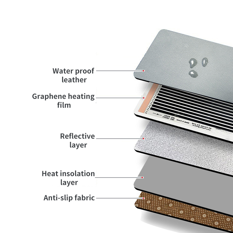 防水表面でお手入れ簡単。グラフェン発熱膜が熱伝導が速く、局部過熱なし。反射保温層が熱を上方に集め、断熱層が床からの冷気を遮断。滑り止め底面で安定し、ずれにくい。