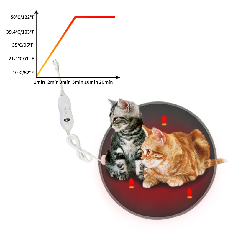 約5分の速暖、電源投入即時に温かく、約5分で安定温度域に到達(図示の最高温度は約50℃/122°F)。温度は持続的に安定し、ペットが寄りかかった瞬間から温もりを感じられます。